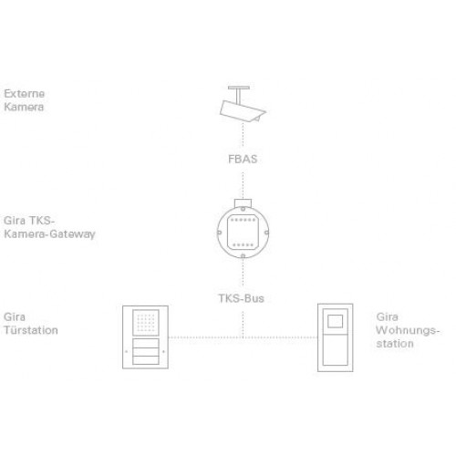 Варианты дизайна рамокGira TKS-шлюз камеры домофонной системы объединяет внешние аналоговые камеры в единую систему через 2-проводную шину и устройство видеонаблюдения. Таким образом, без особых усилий камера может быть объединена с дверной станцией. Несколько DCS-шлюзов могут работать последовательно или в звездной конфигурации. Таким образом, можно иметь несколько свободно выбираемых областей с одной домашней станцией, таких как, например, вход со двора, задняя дверь или фронтальный обзор входной зоны.